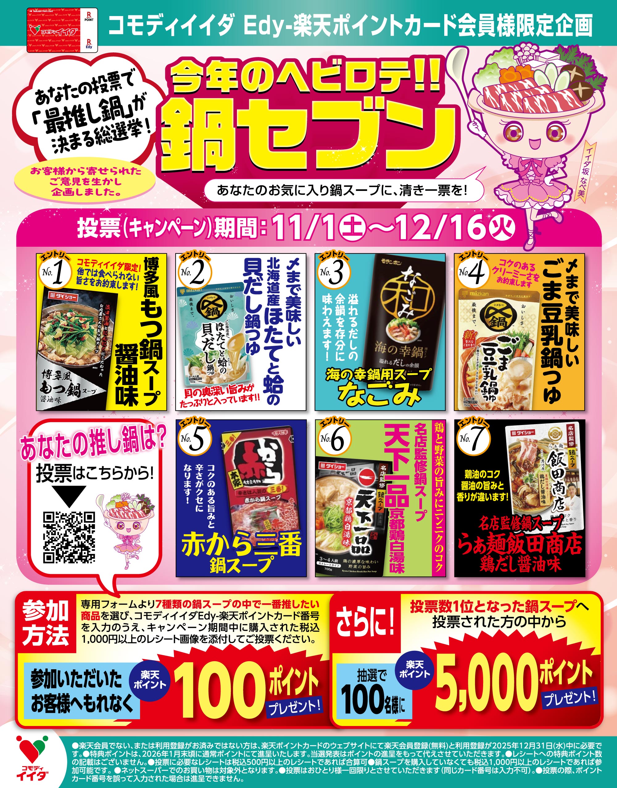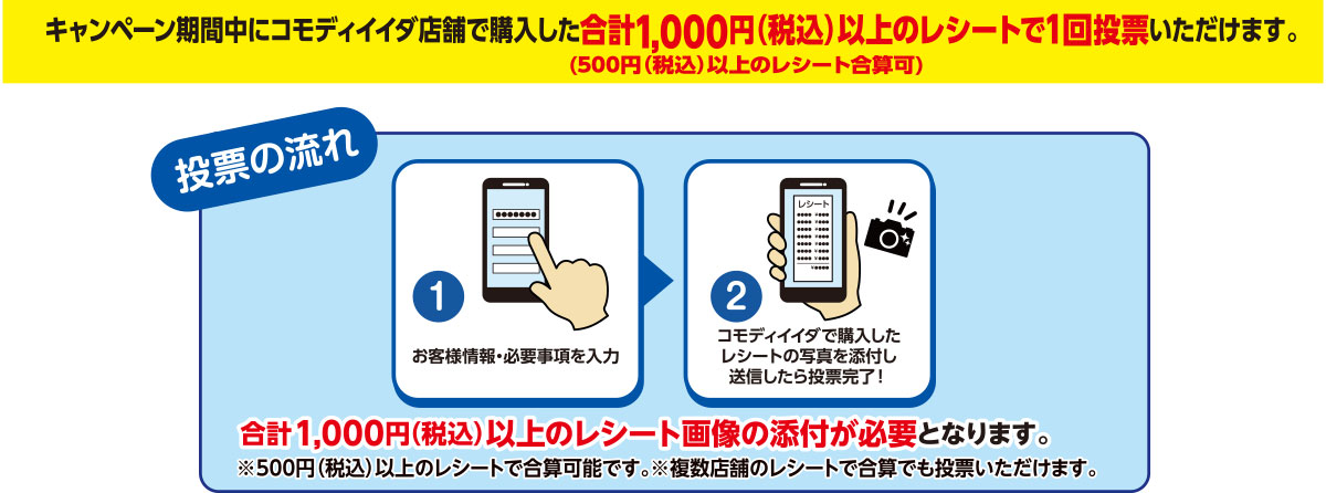 ※ご家族間などでの同一レシートご利用は無効となります。※コモディイイダ以外で購入したレシートで投票など不正行為が発覚した場合、当選の権利を無効とさせていただきます。※投票の際、ポイントカード番号を誤って入力された場合はポイントは進呈できません。