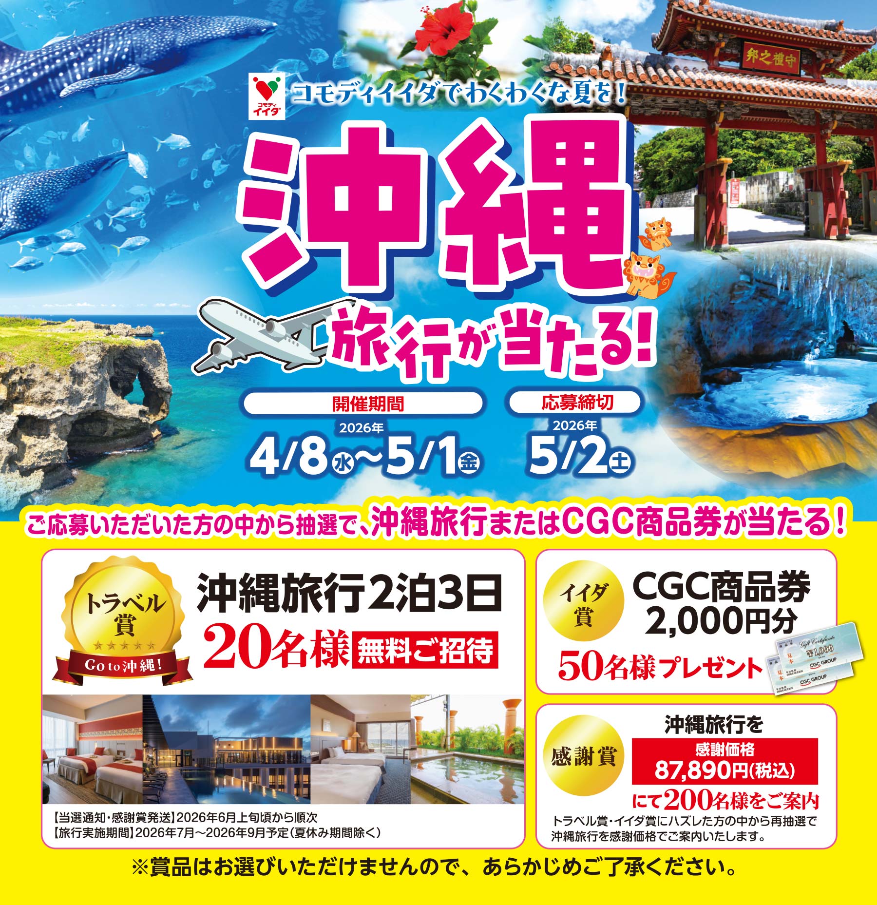 ※当選者の権利はご本人に限り有効です。 他者への譲渡、換金、売買、返品は一切できません。※沖縄旅行の集合場所までの交通費はお客様のご負担となります。※同じレシートで複数回応募やコモディイイダ以外で購入したレシートで応募など不正行為が発覚した場合、当選の権利を無効とさせていただきます。※本キャンペーンのご当選者様は、同時期に同一商品を対象とした他キャンペーンには重複して当選できない場合がございます。予めご了承ください。※お客様から頂いたすべての個人情報は、当キャンペーンに関するお問い合わせ、抽選、ご案内のために使用いたします。なお、お客様の事前の承認なく第三者に提供することはありません。