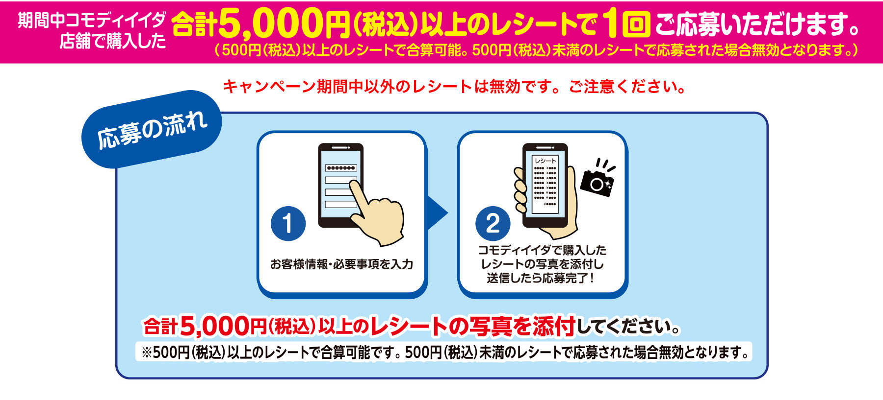 ※期間中にコモディイイダの店舗で購入したレシートに限ります。 ※レシートのコピーでのご応募はできません。 ※同じレシートで複数回応募はできません。 ※ネットスーパーは対象外です。